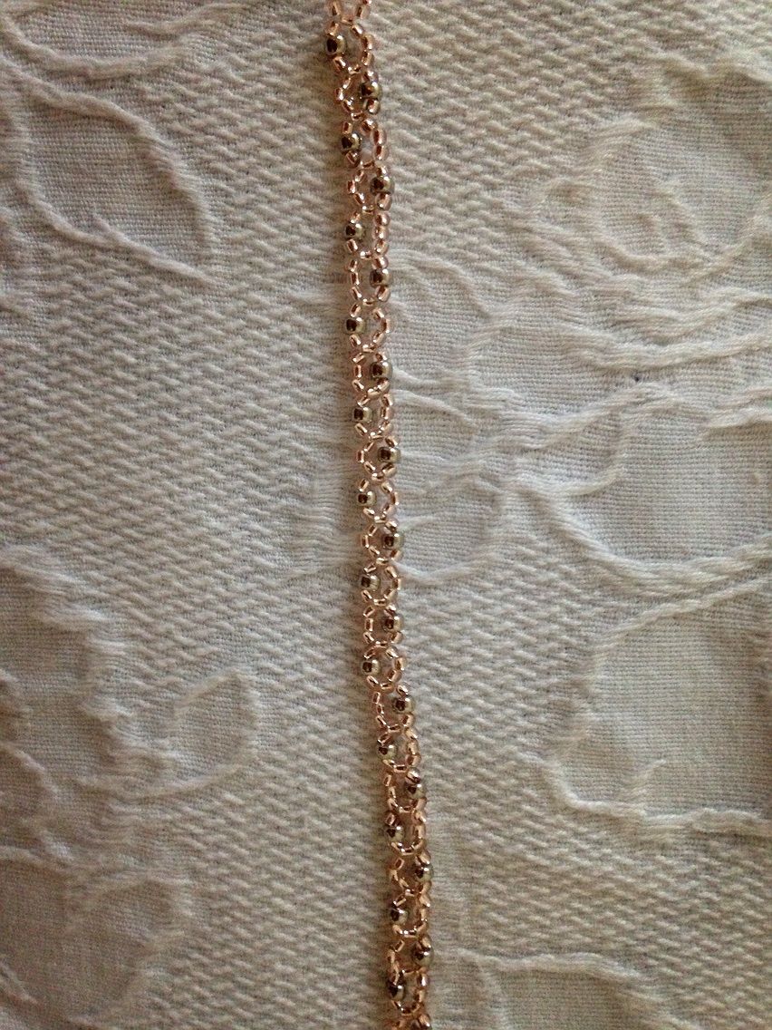 徒然なるままに、8の字編みをしてみました。淡いピンクの透明ビーズに、実家近くの手芸屋で衝動買いした高級メッキビーズ(SALE価格)をふんだんに散りばめております。